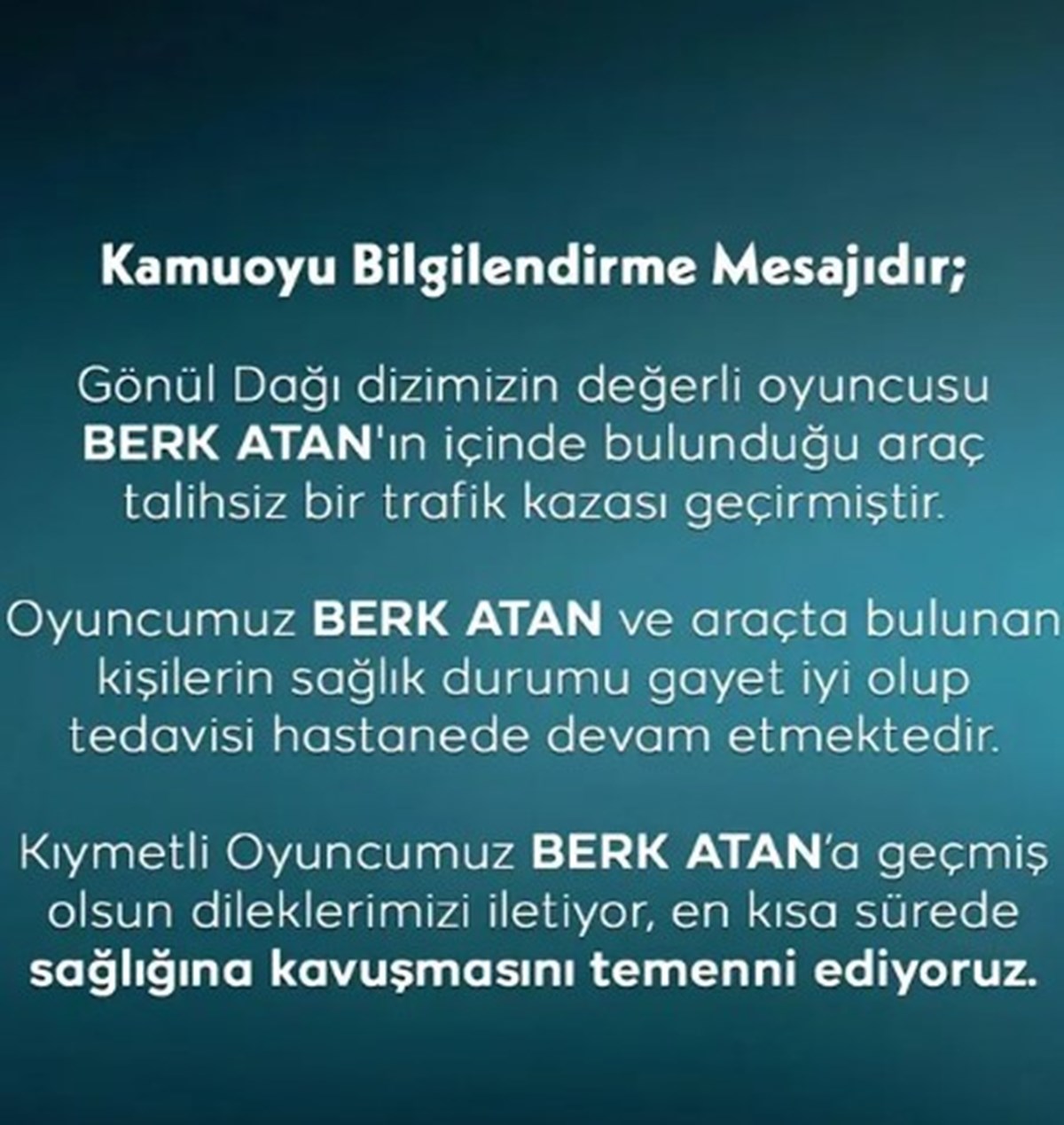 "Gönül Dağı dizimizin değerli oyuncusu Berk Atan'ın içinde bulunduğu araç talihsiz bir trafik kazası geçirmiştir. Oyuncumuz Berk Atan ve araçta bulunan kişilerin sağlık durumu gayet iyi olup tedavisi hastanede devam etmektedir. Kıymetli oyuncumuz Berk Atan'a geçmiş olsun dileklerimizi iletiyor, en kısa sürede sağlığına kavuşmasını temenni ediyoruz."